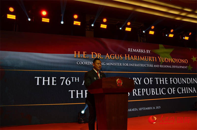 人民网雅加达9月25日电 (记者李培松)9月24日,中国驻印尼使馆举办招待会,庆祝中华人民共和国成立76周年。中国驻印尼大使王鲁彤,印尼政府代表—基础设施与区域发展统筹部长阿古斯、人口流动部长伊夫提塔赫、总统特使普尔诺莫、基础与中等教育部长穆蒂等政要,外国驻印尼使节及中资企业、华侨华人代表等800余人出席。